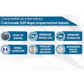 BENEFÍCIOS EXTERNOS DO COLCHÃO Tipo de Pillow - Pillow Top Europeu Tipo de Bordado do Tecido de Revestimento - Bordado Contínuo Tipo Tecido de Forração Revestimento - Jacquard em Malha - Malha 3D Cor do Tecido do Tampo Tipo de Tecido de Revestimento da Faixa Lateral - Em Chenile Tecido com Tratamento - AntiÁcaro e AntiFungo Modo de Utilização - Sistema Double Side