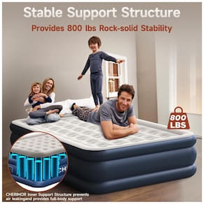 A solução de sono confortável de Cloreto de Polivinila. O colchão de ar queen da CHERIMOR de 203x152x48cm apresenta uma superfície superior feita de material aveludado macio e seguro para crianças. Além de agradável ao toque e respirável, é fácil de limpar, adequado para todos os tipos de dorminhocos. Com 40 câmaras, suporta até 362 kg, oferecendo conforto comparável aos colchões de molas de alta qualidade. Feito de PVC antipuncionamento 40% mais espesso, com processo de prensagem a quente de três camadas, possui fundo antiderrapante e silencioso.