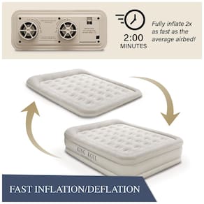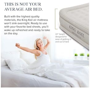 Experimente uma experiência de conforto sem igual com o colchão de ar queen da King Koil, apresentando um luxuoso pillow top e travesseiro integrado que oferecem suporte personalizado para cabeça e pescoço, ideal para o sono refinado. Equipado com uma bomba patenteada de alta velocidade de 110v/210w, nosso colchão premium infla em menos de dois minutos. Projetado com tecnologia CoilBeam avançada e camada flocada ajustável, oferece firmeza personalizável e suporte incomparável. Feito com materiais duráveis e à prova d'água, seu design sofisticado garante portabilidade sem comprometer a qualidade premium.