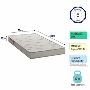 Marca: Completa Móveis | Modelo: Solteiro Light | Material: Espuma 100% Poliuretano | Densidade: D23 | Revestimento: Tecido 100% Poliéster | Comprimento (cm): 188 | Largura (cm): 78 | Altura (cm): 12 | Peso do Produto (Kg): 3,72 | Quantidade de Volume: 1 | Peso Suportado do Colchão (Kg): 80 | Tamanho do Colchão: Solteiro | Dimensão (A x L x C): 12x78x188 cm | Duração da Garantia: 6 Meses | País de Origem: | Tipo de Garantia: Garantia do Fornecedor | É Colchão na Caixa: Não