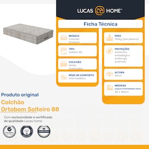 Seja bem-vindo(a) a LUCAS HOME! Uma cama só está completa se você escolher o colchão certo para seus momentos de descanso. O colchão de molas ensacadas Ortobom Airtech, ideal para o seu aconchego e bem-estar, trazendo conforto e durabilidade, garantia certificada para seu descanso e momentos de tranquilidade, além de melhorar a qualidade do seu sono. Suporta até 120kg por pessoa, e estrutura que possui tratamentos antiácaro, antimofo e antifungo para proporcionar noites tranquilas e confortáveis.