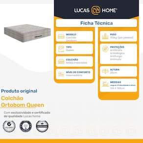 Seja bem-vindo(a) a LUCAS HOME! Uma cama só está completa se você escolher o colchão certo para seus momentos de descanso. O colchão de molas ensacadas Ortobom Airtech, ideal para o seu aconchego e bem-estar, trazendo conforto e durabilidade, garantia certificada para seu descanso e momentos de tranquilidade, além de melhorar a qualidade do seu sono. Suporta até 120kg por pessoa, e estrutura que possui tratamentos antiácaro, antimofo e antifungo para proporcionar noites tranquilas e confortáveis.