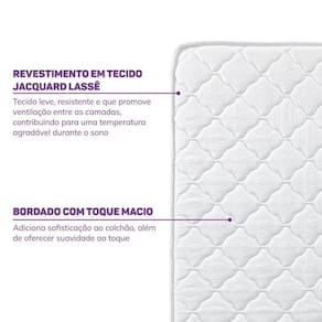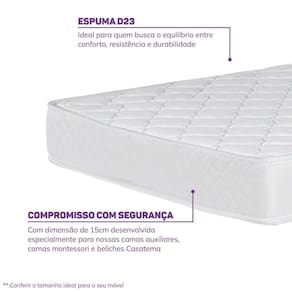 Colchão de Solteiro para Cama Auxiliar D23 188 X 78 X 15cm Casatema Branco. Desenvolvido com espuma D23 de alta qualidade, o colchão Nuvem oferece um conforto uniforme e um toque suave sem abrir mão da durabilidade com espuma de poliuretano. O colchão possui tecnologia Pillow Top Double side, super prática no dia a dia pois proporciona uma superfície aconchegante por igual e ainda aumenta a durabilidade do colchão, permitindo o uso em ambas as faces. Seu revestimento conta com tecido jacquard lassê. Caracterizado pela resistência e durabilidade. Pelo fato de ser um tecido leve, permite que o colchão transpire entre as camadas, proporcionando conforto ao usuário. A trama plana garante um visual limpo e uniforme ao tecido. Para garantir um toque suave ao produto as tampas possuem um bordado na superfície. Este colchão também é compatível para o uso com as camas, bicama, camas auxiliares, beliches e camas altas Casatema, que possuem tamanho compatível com o colchão de 78x188cm, se enquadrando nas normas de segurança de uso. Invista em um descanso com a qualidade, segurança a durabilidade que só CasaTema pode proporcionar.