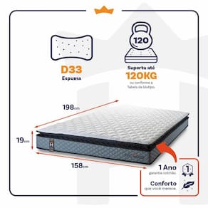Feito com os mais nobres materiais em sua composição, ele conta com espuma D33 . Por ser mais macio, o colchão traz benefícios e ajuda no alinhamento da coluna. O colchão King House acomoda melhor o contorno do corpo, dispondo de forma correta quadris e ombros, expulsando as dores e problemas de coluna.