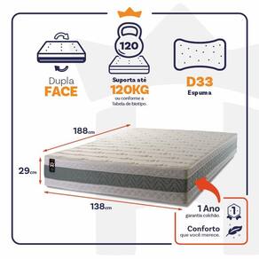 Feito com os mais nobres materiais em sua composição, ele conta com espuma D33 . O colchão King House acomoda melhor o contorno do corpo, dispondo de forma correta quadris e ombros, expulsando as dores e problemas de coluna.