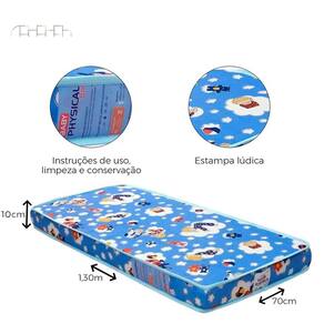 Colchão Baby Physical é produzido em espuma D18, acabamento em debrum revestimento do tecido viscopoli (51% viscose e 49% poliéster), plastico impermeável.