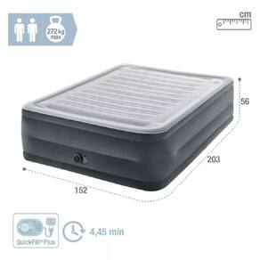 - Marca: Intex - Modelo: 64417 110v ou 64418 220v - Linha: Dura-Beam Deluxe - Material: Flocagem + laminado de PVC - Tempo aproximado de insuflação: 4,45 min - Dimensões (cm) - Altura: 56cm - Largura: 1,52cm - Comprimento: 2,03cm - Peso: 10kg