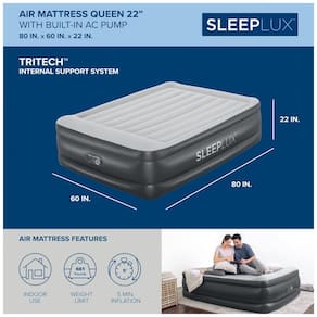 Tenha uma boa noite de descanso o colchão de ar Queen da Sleeplux foi projetado com construção proprietária em viga em I. Composto por 3 camadas duráveis, este colchão inflável manterá sua forma e permanecerá firme durante toda a noite. CONSTRUÇÃO SUPERIOR Os colchões insufláveis Tritech promovem posturas de sono saudáveis. Um núcleo de malha de poliéster denso é colocado entre duas camadas duráveis de PVC, proporcionando suporte de costas e ombros de nível superior. INFLA E DESINFLA COM ESFORÇO ZERO A bomba embutida infla silenciosamente o colchão de ar em apenas 5 minutos com apenas um único toque de um botão CARREGUE SEU TELEFONE Há uma porta USB integrada para carregamento conveniente de dispositivos eletrônicos. Chega de lutar para encontrar a tomada mais próxima Carregue seu telefone enquanto você dorme com facilidade. TUDO O QUE VOCÊ PRECISA O conteúdo inclui 1 colchão de ar duplo com bomba e travesseiro embutidos, 1 bolsa de zenamento para zenamento e transporte convenientes e 1 remendo de reparo em caso de perfuração ou rasgo acidental Marca: Não Informado