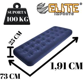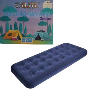 Colchão inflável de solteiro Elite Peso suportado: 100 Kg aproximadamente Peso: 3 kg Válvula para rápido esvaziamento Válvula de ar de segurança dosadora Material PVC Fácil de usar Uso Prático