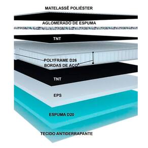 Diferencial do produto: Molas ensacadas : não possuem atrito entre si, oferecendo ausência completa de ruídos. Além disso, agem em conjunto com a espuma e garantem maior firmeza e conforto ao colchão. Como são independentes , a pressão é localizada, ou seja, cada mola se comprime individualmente de acordo com a pressão exercida pelo corpo. Essa característica torna o molejo excelente, principalmente para colchões de casal pois o movimento de uma pessoa não interfere no conforto da outra. Molas Bonnel : as molas Bonnel possuem forma de ampulheta. São chamadas bicônicas por formar dois cones opostos em seu corpo metálico, apresentando um estreitamento no meio. Isso faz com que o colchão proporcione maior elasticidade e conforto. Revestimento inferior: Em tecido antiderrapante tecido 100 poliéster, com detalhes emborrachados. Evita que o colchão deslize sobre a base, trazendo maior segurança e conforto para o sono. Revestimento superior e lateral: Em tecido plano , que não é propenso ao acúmulo de poeira e materiais orgânico, além de ser de fácil higienização.