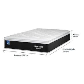 Modelo: Magnum Marca: Plumatex Tamanho: Queen Dimensões: 158x198X28 (Largura x Comprimento x Altura) Conforto: Intermediário Sistema: Molas Ensacadas Pillow: Pillow Top Peso Máximo recomendado: 110 kg (Por pessoa) Proteções: Antiácaro, antialérgico, antifungo, antimofo Garantia: 1 ano pelo fabricante