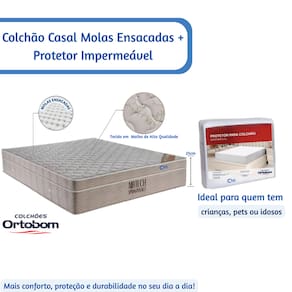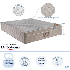 Kit Colchão Ortobom Airtech Casal 138 + Protetor de Colchão Impermeável O Kit é composto por colchão Airtech de Molas Ensacadas e Capa protetora para colchão Impermeável . Colchão Ortobom Airtech – 138x188x25 cm Tipo de molas: ensacadas individualmente Camada de espuma D26. Placa de EPS que contribui para estabilidade. Revestimento em tecido jacquard com viscose. Sistema No Turn (giro sem necessidade de virar). Tratamentos: antiácaro e antialérgico. Suporte de peso: até 120 kg por pessoa Protetor de Colchão Impermeável Ortobom – 138x188 Material: malha 100% poliéster com aplicação de PU. Impermeável e respirável. Tratamentos: antiácaro e antifungo. Fixação com elástico em formato de lençol. Observações Importantes Antes da compra, confira as dimensões do produto e verifique se ele passa por portas, corredores e elevadores do local de entrega