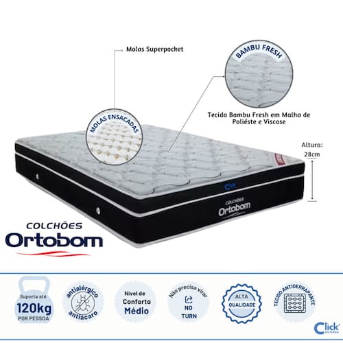 Este colchão oferece conforto e elegância. O colchão possui molas ensacadas individualmente, reforço lateral em PU e camadas de espuma firme para suporte ideal. Perfeito para quem busca durabilidade, suporte firme e um visual sofisticado. Características do Colchão: Largura: 193 cm Comprimento: 203 cm Altura: 28 cm Biotipo suportado: até 120 kg Estrutura interna: Molas ensacadas individualmente Tecido: Malha de poliéster com viscose (exemplo: tecido bambu fresh) Camada de conforto: Espuma firme selada em matelassê Revestimento inferior: Tecido antiderrapante com espuma selada Sistema No Turn: não necessita virar o colchão Nível de conforto: intermediário Garantia do fabricante: 36 meses (molejo) / 90 dias (tecido)