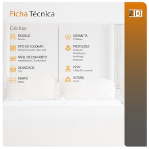 * CAMADAS DE ESPUMA INTERNA Espuma Densidade D33 - A densidade é a quantidade de matéria-prima utilizada para se fazer um colchão. Quanto maior a densidade, maior o suporte que esse colchão terá a pesos mais elevados. Hiper Soft - Espumas Hiper-macias- As espumas hiper-soft são caracterizadas por um toque inicial muito macio, baixa resistência à compressão. São normalmente fabricadas com densidades de 30 kg/m3 e como às viscoelásticas são usadas em aplicações de alto conforto, nas camadas superficiais de colchões