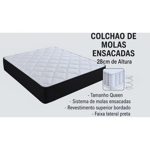 - Proteções: Antiácaro - Antialérgico - Antifungo - Antimofo;- Acabamento: Bordado em Matelassê;- Matéria prima: Poliéster/Bordado;- Mola: Ensacada;- Peso máximo recomendado: até 100kg (por pessoa);- Garantia: 3 meses;- Dimensões do produto (altura x largura x comprimento): 28x158x198cm;