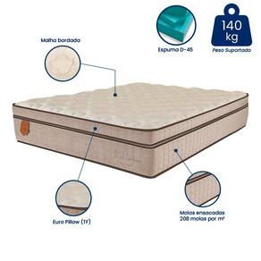 Com estrutura em molas ensacadas com 208 molas por m² que se adaptam a curvatura e formato do corpo, espuma D-45 que juntos garante maior estabilidade ao seu corpo, tornando sua noite de sono muito mais confortável, além de oferecer uma maior sustentação de peso com capacidade para suportar até 140 Kg por pessoa. Além do mais, ele também traz um Euro Pillow Turn Free, que serve como uma camada extra de espuma proporcionando melhor alinhamento e acabamento ao colchão, revestimento em malha bordado, tratamento antimofo, antifungos, antiácaros e antialérgico, tudo para que você possa usufruir e aproveitar ao máximo de um sono tranquilo, relaxado e saudável.