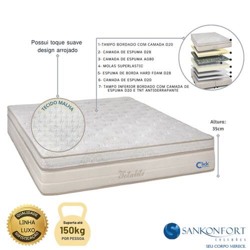 - Enchimento: Molas Superlastic Spring - Molejo construído com molas contínuas entrelaçadas e helicoidais no sentido horizontal. Com maior número de molas por metro quadrado que garante melhor distribuição