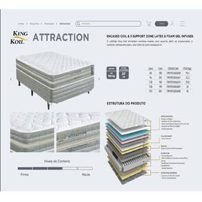 O colchão King Koil Attraction combina maciez com suporte, com um nível de conforto intermediário ao lado de um conjunto de molas ensacadas, além de proporcionar o conforto refrescante para uma noite de sono inesquecível. Ambiente Principal: Quarto Antiácaro: Sim Antialérgico: Sim Antifungo: Sim Certificado: INMETRO Comprimento: 203 cm Cor: Cinza/Branco Cor do Produto: Cinza/Branco Itens Inclusos: 1 Colchão Nível de Conforto: Intermediário Origem do Produto: Nacional Peso: 22.5 Possui Certificado: Sim Possui Pillow: Não Precisa virar: Sim Recomendações de Uso, Manutenção e Limpeza: Fazer o giro quinzenal e manter em local arejado. Revestimento: Malha Tamanho: Solteirão Tipo do Colchão: Mola Ean: 7893955036667