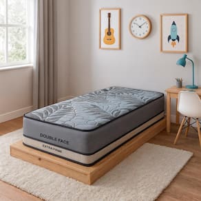 Sitema Double Face. Um lado do colchão com conforto macio, e outro lado com conforto mais firme, deixando duas opções de conforto no mesmo produto.