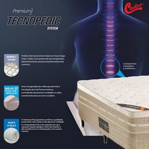 O colchão Premium Tecnopedic® System possui internamente tecnologia Suíça - Molas bicônicas com tratamento térmico em têmperas. Tecnologia interna desenvolvida com matéria prima importada, e mais molas por m², todas feitas em espiral proporcionando maior estabilidade no colchão. Tecnopedic® é a evolução do Bonnel, e é exclusivo da Castor no Brasil. As molas Tecnopedic®, da Castor, proporcionam uma maior firmeza no molejo por possuir bordas em Edge Metal (molas estabilizadoras), que além de terem uma durabilidade prolongada, não emitem ruídos quando houver movimentação dos corpos. Nas laterais, ainda existe uma malha de Aria 3D, que promove uma ventilação constante de ar no colchão, além de controlar a umidade e o calor durante as suas noites de sono. GARANTIA DO COLCHÃO - 36 meses no molejo - 12 meses no estofamento- 90 dias no tecido ESTRUTURA INTERNA- Molas Tecnopedic® System (Bonnel Evoluído) – Molas feitas em aço temperado com maior resistência.- União das molas feita em espiral e armação com mais molas por m².- Bordas perimetrais em espuma de alta resiliência.- Revestida por feltro em toda sua armação, proporcionando maior estabilidade no colchão. Enchimento interno:- 01 lâmina D20- 01 lâmina D28 ESTRUTURA EXTERNALateral do colchão - Tecido boucle- Espuma D20 Faixa lateral do colchão - Tecnologia Aria 3D - Promove uma ventilação constante de ar no colchão. Tampão superior- Tecido malha Apollo.- 01 Espuma de poliuretano hiper macia D20.- Bordado desenho L.LOOP- Acabamento em Debrum - Fitas que reforçam todo seu acabamento e suas bordas laterais. Tampão inferior - Tecido cetim branco liso Tecnologia - Molas Tecnopedic SystemTratamento - Aria 3D , Manta AcrílicaBiotipos (por pessoa) - Até 120KgTamanho - SolteiroMedida - 88x188Altura - 30cmPillow Top - One FaceConforto - FirmeTecido - PoliésterCor -Bege Ean: 7895606136740