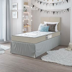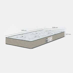INFORMAÇÕES COLCHÃO: - Tecido de revestimento: Poliéster Bordado - Cor: Branco c/ Lateral em Suede Bege - Modelo: Solteiro One Face (uma face) - Dimensão: 0,17x0,88x1,88 - Peso limite: 120 kg por pessoa - Peso do produto: 4,6 kg - Material de estrutura: Espuma D33/EPS - Tipo de conforto: Intermediário