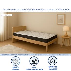 Colchão Solteiro Espuma D20 - 88x188x12cm Este colchão solteiro com espuma de densidade D20 é uma solução prática e econômica. Ideal para camas auxiliares, quartos de crianças ou para receber hóspedes.Características Técnicas e Uso:Densidade D20: Espuma de poliuretano com densidade adequada para suportar até 50kg de peso. Altura : Possui 12 cm de altura, medida ideal para ser utilizado em Bicamas e camas auxiliares.Tamanho Padrão: Medidas de 88 cm de largura por 188 cm de comprimento.Indicação: Uso infantil, camas de apoio e hóspedes.