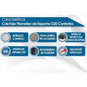 Camadas Interna do Estofamento de Espuma do Colchão - Alta Qualidade Densidade da Espuma do Colchão - 20 Nível de Firmeza do Colchão - Macio c/ Firmeza Peso Máximo Suportado do Colchão - 50 kg