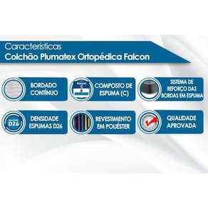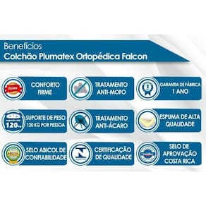 Imagens Meramente Ilustrativas. Não nos responsabilizamos pela montagem/instalação dos produtos. Todas as informações divulgadas são de responsabilidade exclusiva do fabricante/fornecedor. Tipo Tecido de Forração Revestimento: Malha Importada | Nível de Firmeza do Colchão: Firme | Nossa Avaliação: Qualidade Boa | Peso Máximo Suportado: 120 kg | Tempo de Garantia: 12 meses | Certificados de Qualidade: Qualidade Aprovada | Tipo de Tecido de Revestimento da Faixa Lateral: Decorativa | Cor do Tecido do Tampo: Claro Estampado | Tipo de Bordado do Tecido de Revestimento: Contínuo | Tecido com Tratamento: AntiÁcaro e AntiFungo | Camadas Interna do Estofamento de Espuma: Alta Qualidade | Cor do Tecido de Revestimento da Faixa Lateral: Escura Estampada | Densidade da Espuma: 26 | Código universal de produto (GTIN): 7899076944200 | Produto precisa de Montagem?: Sim, a montagem é simples mas sugerimos a contratação do nosso serviço de montagem (para os CEPs em que o serviço está disponível) ou de algum profissional experiente de sua preferência | Descrição do Tamanho: 18.00x:88.00x188.00 cm | Estado de Origem: RJ | País de origem: Nacional | Peso Produto Com Embalagem (Kg): 22.33 | Material para Filtro: N/I | Cor Mobly: N/I | Condição do Item: Novo | Link Site: https://www.costaricacolchoes.com.br/produtos.asp?produto=23083 | Numeral: 0 | Não se Aplica: N/A | Não Possui: Não | Linha/Modelo: Plumatex | Cor Cnova: Blush | Cor Meli: Ciano | Contatos Sac Fábrica: www.plumatex.com.br | Categoria Trilha: Colchão> Colchão de Espuma D26 | Categoria - Sub: Colchão de Espuma D26 | Categoria - Pai: Colchão | Comprimento Embalagem: 188.00 | Largura Embalagem: 88.00 | Altura Embalagem: 18.00 | Kit: 0 | Peso: 22.33 Kg | Peso Real Kg: 22.33 | Peso Cubado: 74.45 | Volumes: 1 | M3: 0.30 | Comprimento/Profundidade: 188 cm | Largura: 88 cm | Altura: 18 cm | Tamanho Montado: Larg:88.00 x Comp/Prof:188.00 x Alt: 18.00 | Comprimento/Profundidade Montado: 188.00 | Largura Montado: 88.00 | Altura Montado: 18.00 | Tamanho Cama Colchão: Solteiro | Data Cadastro: 2024-1-12 14:55:22 | Sigla Estoque: 7 | Marca: Plumatex