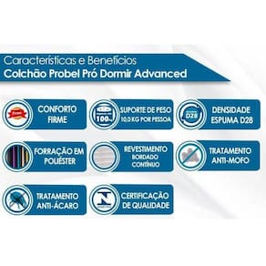 Todas as informações divulgadas são de responsabilidade exclusiva do fabricante/fornecedor. Tipo Tecido de Forração Revestimento: Poliéster | Tipo de Conforto: Macio c/ Firmeza | Nossa Avaliação: Qualidade Boa | Peso Máximo Suportado: 60 kg | Tempo de Garantia: 12 meses | Certificados de Qualidade: Qualidade Aprovada | Tipo de Bordado do Tecido de Revestimento: Matelassê | Tecido com Tratamento: AntiÁcaro e AntiFungo | Modo de Utilização: One Side | Tipo de Forração do Revestimento Inferior: Antiderrapante | Camadas Interna do Estofamento de Espuma: D20 | É infantil: Não | É eco-friendly: Sim | É antiácaros: Sim | É ortopédico: Sim | É kit: Não | Material: Tecido | Fonte do produto: N/A | Com moldura perimetral: Não | Com pegas laterais: Não | Número de registro/certificação INMETRO: N/A | Condição do item: Novo | Classificação da Cama: Casal | Produto: N/A | Cômodo Indicado: Multiuso | Código universal de produto (GTIN): 7898594119689 | Condição do Item: Novo | Link Site: https://www.costaricacolchoes.com.br/produtos.asp?produto=19286 | Numeral: 0 | Não se Aplica: N/A | Não Possui: Não | Linha/Modelo: Probel | Cor Cnova: Blush | Cor Meli: Ciano | Contatos Sac Fábrica: assistenciatecnica@probelmercosul.com.br | Categoria Trilha: Colchão> Colchão de Espuma D28 | Categoria - Sub: Colchão de Espuma D28 | Categoria - Pai: Colchão | Comprimento Embalagem: 188.00 | Largura Embalagem: 78.00 | Altura Embalagem: 14.00 | Kit: 0 | Peso: 12.30 Kg | Peso Real Kg: 12.30 | Peso Cubado: 51.32 | Volumes: 1 | M3: 0.21 | Comprimento/Profundidade: 188 cm | Largura: 78 cm | Altura: 14 cm | Tamanho Montado: Larg:78.00 x Comp/Prof:188.00 x Alt: 14.00 | Comprimento/Profundidade Montado: 188.00 | Largura Montado: 78.00 | Altura Montado: 14.00 | Tamanho Cama Colchão: Solteiro | Data Cadastro: 2023-7-1 16:56:10 | Sigla Estoque: 2 | Marca: Probel