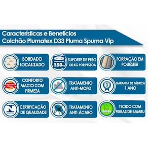 Densidade da Espuma do Colchão - D33 Nível de Firmeza do Colchão - Macio c/ Firmeza Peso Máximo Suportado do Colchão - 130 kg