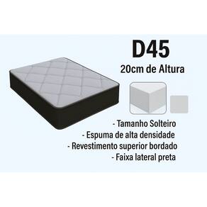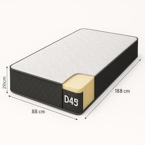 O Colchão com Espuma D45 é altamente resistente e confortável, proporcionando melhor sustentação e durabilidade ao produto, o tampo é bordado, que entrega uma camada extra de conforto. Seu revestimento é com tratamento antialérgico e antiácaro. Esse é o colchão ideal para toda a família.