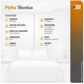 Colchão Solteiro Madison Espuma D20 Bordado 88x188x17cm O Colchão Madison possui espuma D20 produzida com um ótimo padrão de qualidade, passando por diversos controles de qualidade proporcionando assim o Madison uma excelente opção para nossos clientes em relação ao custo-benefício deste produto. Utilizando as melhores espumas do mercado, o colchão Madison proporciona um conforto muito elevado, os colchões de espuma são mais firmes que os de mola, trazendo para nossos clientes um sono perfeito.
