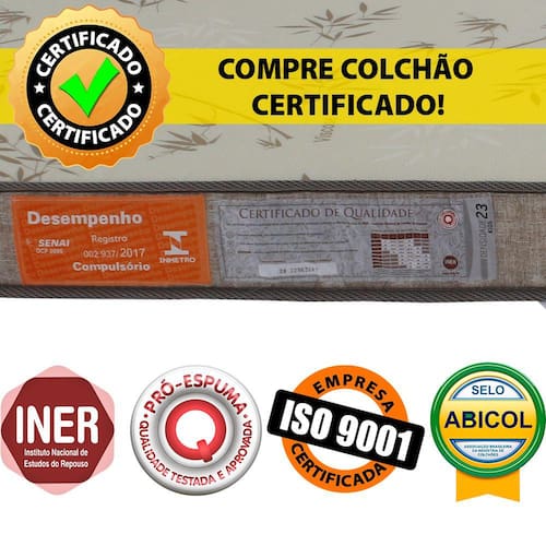 Características: - Espuma Densidade 23 (D23) - Nível de Conforto: Suporte médio com toque macio - Tratamento do Tecido: Agente antimicrobiano (Anti-Ácaro / Antialérgico). - Tecido Superior: Maquinetado 100% Poliéster - Tecido Lateral: Microfibra - Certificado Pelo Inmetro e Iner