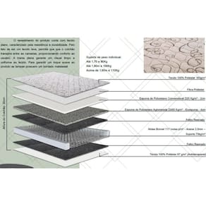 Camadas Interna do Estofamento de Espuma do Colchão - Alta Qualidade Tipo de Espuma do Colchão - Espuma sem CFC Tipo de Mola do Colchão - Bonnel Nível de Firmeza do Colchão - Macio c/ Firmeza Peso Máximo Suportado do Colchão - 110 kg