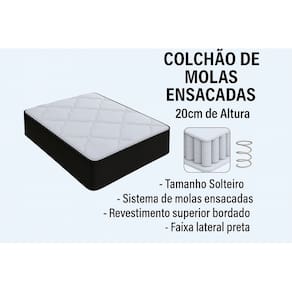 - Proteções: Antiácaro - Antialérgico - Antifungo - Antimofo;- Acabamento: Bordado em Matelassê;- Matéria prima: Poliéster/Bordado;- Mola: Ensacada;- Peso máximo recomendado: até 100kg (por pessoa);- Garantia: 3 meses;- Dimensões do produto (altura x largura x comprimento): 20x88x188cm;