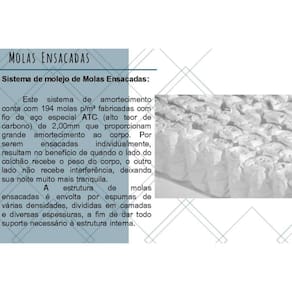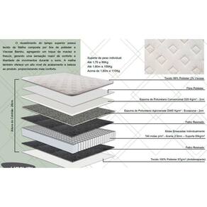 COLCHÃO (CARACTERISTICAS) Camadas Interna do Estofamento de Espuma - AG - D20 Tipo de Mola - Ensacadas MasterPocket Nível de Firmeza do Colchão - Firme Peso Máximo Suportado - 90 kg