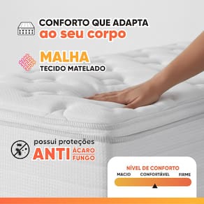 REVESTIMENTO SUPERIOR E LATERAL: Tecido Malha Bordado, que oferece maciez, durabilidade e um acabamento sofisticado, permitindo melhor ventilação. Conta ainda com Pillow Top, que intensifica a sensação de conforto