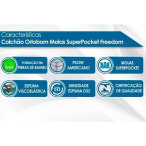 CARACTERÍSTICAS INTERNAS DO COLCHÃO Sistema de molas - Ensacadas SuperPocket Camadas Interna do Estofamento de Espuma - D33 - Viscoelástica Outras Características Internas - Espuma de Poliol Vegetal - c/ Sistema Polyframe - Manta Acrílica