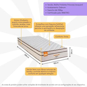 Imagem meramente ilustrativa. A estampa pode sofrer variações conforme o lote do produto. Acabamento: Debrum | Tecido: Malha Poliéster/Viscose/Jacquard | Tipo de Enchimento: Molas Ultralastic | Referência do Modelo: CR445A | Linha: Pequim | Tonalidade: Branco | Altura Montado: 26 | Largura Montado: 88 | Profundidade Montado: 188 | Tamanho (L x A x P): 88 x 26 x 188 | Conforto: Firme | Com Pillow: Sim | Tipo de Pilow: Europillow | É Duplo Pillow: Não | Densidade: N/A | Peso Máximo Suportado: 150 kg | Capacidade: Até 150 kg por pessoa | Instruções de Cuidado: Limpeza a seco e aspiração de pó. Indicamos o giro a cada 15 dias. | Necessita de Montagem: Não | É antiácaros: Não | É hipoalergênico: Não | É eco-friendly: Sim | Classificação do Colchão: Solteiro | Tipo do Colchão: Padrão | Estrutura do Colchão: Mola | Peso do Produto: 17 | Produto: Colchão | Garantia do Fabricante: 12 | Conteúdo da Embalagem: 1 colchão e manual. | Tamanho: Solteiro | É infantil: Não | Fabricante: Inducol | Altura (cm): 26 cm | Largura (cm): 88 cm | Comnto (cm): 188 cm | Estado de Origem: RS | Produto precisa de Montagem?: Não | É colchão na caixa: Não | Altura do Produto com Embalagem: 26 | Largura do Produto com Embalagem: 88 | Comnto do Produto com Embalagem: 188 | Peso do Produto com Embalagem: 17 | Nome do Produto no Fornecedor: Colchão Solteiro Pequim 88x188cm Molas Ultralastic Softgel Inducol CR445A Branco/Bege | Descrição do Tamanho: (L x A x P): 88 x 26 x 188 cm | Tempo de Garantia: 12 meses | Destaque 1: Tamanho do colchão (L x A x P): 88 x 26 x 188 cm | Destaque 2: Suporta até 150 kg por pessoa. | Destaque 3: Revestimento em Malha Poliéster/Viscose/Jacquard. | Destaque 4: Enchimento de Molas Ultralastic: conforto e qualidade nas suas noites de sono. | Destaque 5: Nível de Conforto: Firme | Registro INMETRO: 09977-001-03/2023 | FloorToTop (cm): 26 Centimetros | SideToSide (cm): 88 Centimetros | HeadToToe (cm): 188 Centimetros | Sistema de molas: Molas Ultralastic | Quantidade de caixas de embalagem: 01 | É embalado a vácuo: Não | É ortopédico: Não | Com EPS: Não Cor: Branco/Bege