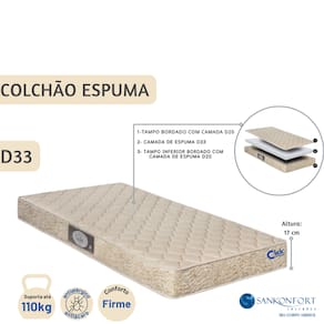 O Colchão Toulon D33 é a escolha perfeita para quem busca um descanso com mais firmeza e suporte. Sua camada de espuma D33 de altíssima qualidade é o grande diferencial, proporcionando maior resistência, conforto duradouro e excelente sustentação corporal. Revestido com tecido especial em fios de alta performance, composto por poliéster e algodão, o Toulon D33 oferece um toque suave e agradável à pele. Seu acabamento nobre e exclusivo garante mais sofisticação ao ambiente. Conta ainda com tratamento antiácaro e antialérgico, promovendo noites mais seguras e tranquilas, ideais para pessoas sensíveis ou alérgicas. Desenvolvido pela Sankonfort Colchões, sinônimo de qualidade e tecnologia de ponta no mercado de descanso. Ficha Técnica: Modelo: Toulon D33 Espuma: Camada principal D33 com suporte de base D20 Altura: 14 cm Revestimento: Tecido especial (72% Poliéster / 28% Algodão) Tratamentos: Antiácaro e Antialérgico Biotipo indicado: Até 110 kg Conforto: Firme com excelente suporte