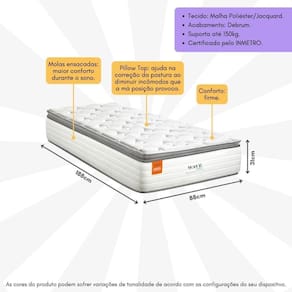 Imagem meramente ilustrativa. A estampa pode sofrer variações conforme o lote do produto. Acabamento: Debrum | Tecido: Malha Poliéster/Jacquard | Tipo de Enchimento: Molas Ensacadas | Referência do Modelo: CR448A | Linha: Wave | Tonalidade: Branco | Altura Montado: 31 | Largura Montado: 88 | Profundidade Montado: 188 | Tamanho (L x A x P): 88 x 31 x 188 | Conforto: Firme | Com Pillow: Sim | Tipo de Pilow: Pillow Top | É Duplo Pillow: Não | Densidade: N/A | Peso Máximo Suportado: 130 kg | Capacidade: Até 130 kg por pessoa | Instruções de Cuidado: Limpeza a seco e aspiração de pó. Indicamos o giro a cada 15 dias. | Necessita de Montagem: Não | É antiácaros: Não | É hipoalergênico: Não | É eco-friendly: Sim | Classificação do Colchão: Solteiro | Tipo do Colchão: Padrão | Estrutura do Colchão: Mola Ensacada | Peso do Produto: 22 | Produto: Colchão | Garantia do Fabricante: 12 | Conteúdo da Embalagem: 1 colchão e manual. | Tamanho: Solteiro | É infantil: Não | Fabricante: Inducol | Altura (cm): 31 cm | Largura (cm): 88 cm | Comnto (cm): 188 cm | Estado de Origem: RS | Produto precisa de Montagem?: Não | É colchão na caixa: Não | Altura do Produto com Embalagem: 31 | Largura do Produto com Embalagem: 88 | Comnto do Produto com Embalagem: 188 | Peso do Produto com Embalagem: 22 | Nome do Produto no Fornecedor: Colchão Solteiro Wave 88x188cm Molas Ensacadas Softgel Inducol CR448A Branco | Descrição do Tamanho: (L x A x P): 88 x 31 x 188 cm | Tempo de Garantia: 12 meses | Destaque 1: Tamanho do colchão (L x A x P): 88 x 31 x 188 cm | Destaque 2: Suporta até 130 kg por pessoa. | Destaque 3: Revestimento em Malha Poliéster e Jacquard. | Destaque 4: Enchimento de Molas Ensacadas: conforto e qualidade nas suas noites de sono. | Destaque 5: Nível de Conforto: Firme | Registro INMETRO: N/A | FloorToTop (cm): 31 Centimetros | SideToSide (cm): 88 Centimetros | HeadToToe (cm): 188 Centimetros | Sistema de molas: Molas Ensacadas | Quantidade de caixas de embalagem: 01 | É embalado a vácuo: Não | É ortopédico: Não | Com EPS: Não Cor: Branco