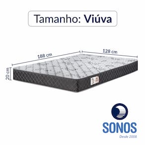 - Modelo: Home 28 Viúva - Dimensões: 128 x 188 x 20 cm (largura x comprimento x altura) - Estrutura: Espuma D28 convencional - Revestimento: Tecido 100% poliéster - Design: Dupla face - Suporte de peso: até 90 kg por lado - Cor: Branco - Origem: Indústria Brasileira - Marca: Sonos