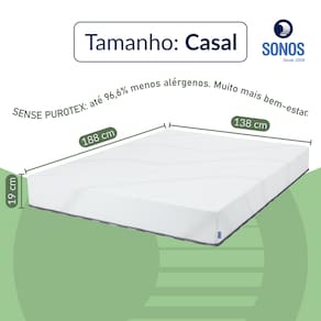 - Dimensões do colchão aberto: 138 x 188 x 19 cm - Dimensões do colchão enrolado: aproximadamente 27 x 27 x 143cm - Estrutura: 100% espuma D28 - Uso: Face única - Revestimento: Malha 280 g/m² com tecnologia Purotex - Suporte de peso: até 90 kg por pessoa - Sistema de envio: Colchão enrolado a vácuo - Origem: Indústria Brasileira - Marca: Sonos