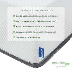 O revestimento em malha 280 g/m² com tecnologia Purotex contribui para um ambiente de sono mais saudável. Essa tecnologia utiliza microcápsulas com probióticos naturais, ativadas pelo contato e fricção durante o uso, auxiliando na redução de alérgenos como ácaros e poeira e mantendo a superfície do colchão mais limpa e fresca de forma natural.