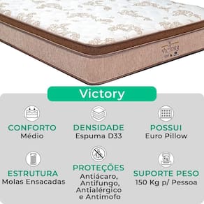 Este modelo também conta com EPS, garantindo maior resistência e durabilidade. Com um peso máximo recomendado de 150 kg por pessoa, o colchão Victory é robusto e resistente, ideal para quem busca um produto durável. Além disso, ele possui proteções contra ácaros, fungos, mofo e alergias, promovendo um ambiente de sono mais saudável e confortável. A V-Store oferece uma garantia de 12 meses, proporcionando ainda mais e tranquilidade na sua compra. Com o colchão Victory, você vai transformar seu descanso, desfrutando de uma noite de sono reparadora e de alta qualidade.