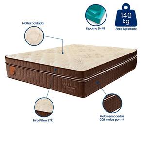 Com estrutura em molas ensacadas com 208 molas por m² que se adaptam a curvatura e formato do corpo, espuma D-45 que juntos garante maior estabilidade ao seu corpo, tornando sua noite de sono muito mais confortável, além de oferecer uma maior sustentação de peso com capacidade para suportar até 140 Kg por pessoa. Além do mais, ele também traz um Euro Pillow Turn Free, que serve como uma camada extra de espuma proporcionando melhor alinhamento e acabamento ao colchão, revestimento em malha bordado, tratamento antimofo, antifungos, antiácaros e antialérgico, tudo para que você possa usufruir e aproveitar ao máximo de um sono tranquilo, relaxado e saudável.