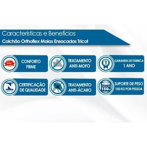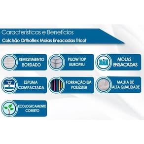 COLCHÃO (BENEFÍCIOS) Vantagens Extras de Colchão - Ecologicamente Correto - c/ Sistema Polyframe - Manta Acrílica Tipo de Pillow - Pillow Top Europeu Tecido com Tratamento - AntiÁcaro e AntiFungo Tipo de Bordado do Tecido de Revestimento - Matelassê Tipo Tecido de Forração Revestimento - Poliéster - Malha de Alta Qualidade Tipo de Forração do Revestimento Inferior - Antiderrapante Tipo de Tecido de Revestimento da Faixa Lateral - Bordado Modo de Utilização - One Side