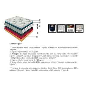 COLCHÃO (CARACTERISTICAS) Camadas Interna do Estofamento de Espuma - AG - D20 Tipo de Mola - Ensacadas MasterPocket Nível de Firmeza do Colchão - Firme Peso Máximo Suportado - 150 kg