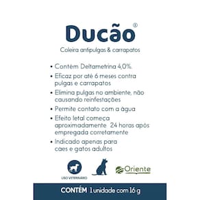 Coleira Antipulgas e Carrapatos Ducão Cães e Gatos 16g A Coleira Antipulgas e Carrapatos Ducão foi desenvolvida para oferecer proteção eficaz contra pulgas e carrapatos em cães e gatos adultos. Sua fórmula contém Deltametrina 4,0%, garantindo ação prolongada e segura por até 6 meses contínuos. O produto atua eliminando parasitas diretamente no animal e também no ambiente, evitando novas infestações. É resistente à água, permitindo que o pet mantenha a proteção mesmo durante banhos ou em dias chuvosos.
