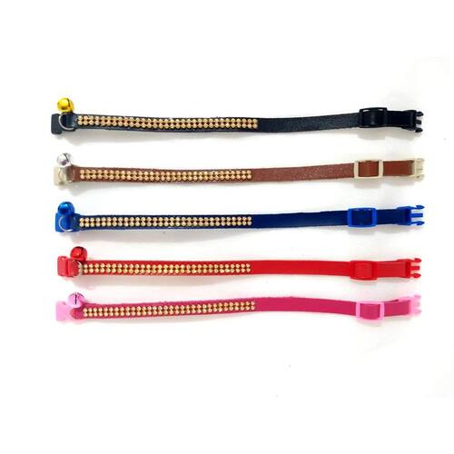 Oleira em couro com aplicação de strass e guizo; Presilha de plástico com passadores de ajuste; Guizo coloridos; Produto especifico para gatos; Tamanho único; Display com 05 coleiras nas cores azul, rosa, vermelho, marrom e preto. Especificações: Circunferência do pescoço: 19 cm a 33 cm. O seu gato vai ficar todo estiloso e alegre com a coleira de couro com Strass com guizo. Marca: Nica pet